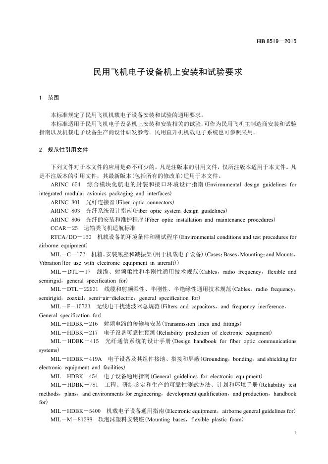 HB 8519-2015 民用飞机电子设备机上安装和试验要求(2017)
