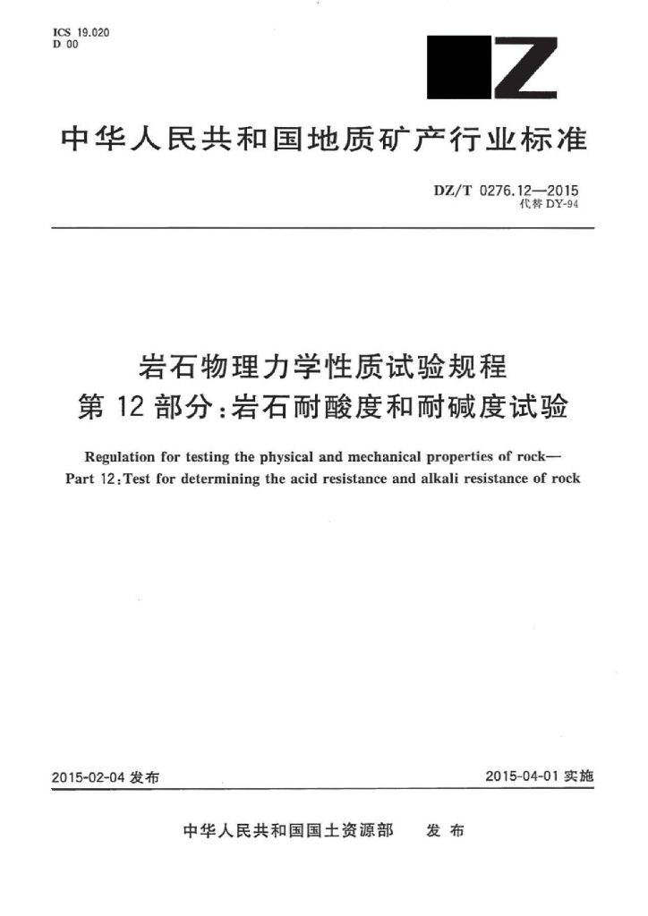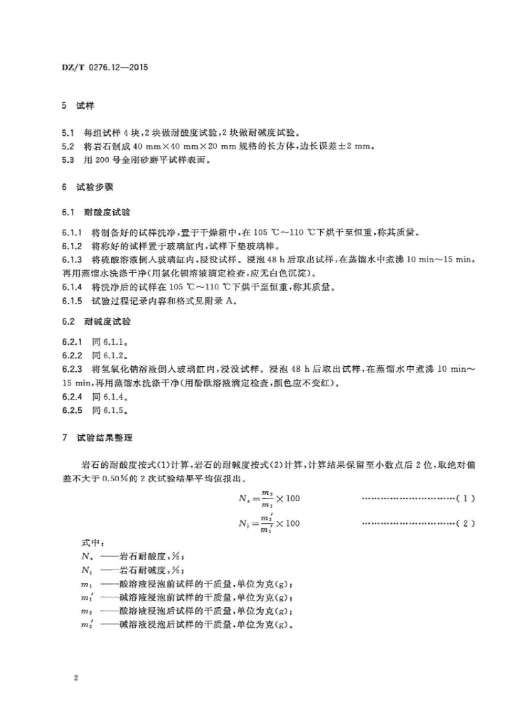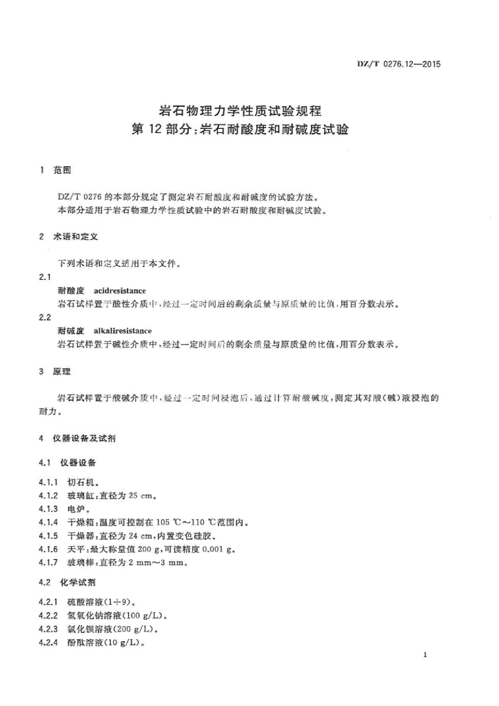 DZ/T 0276.12-2015 岩石物理力学性质试验规程 第12部分:岩石耐酸度和耐碱度试验