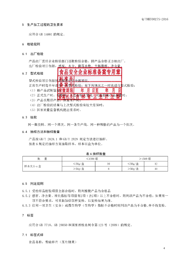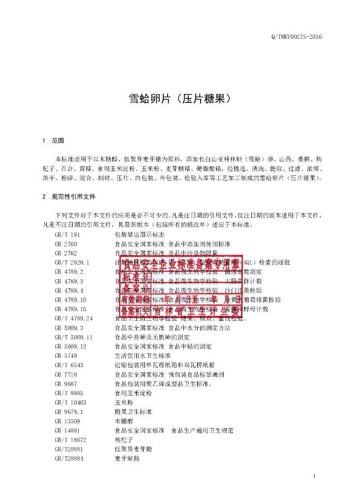Q/THKY 0027S-2016 通化康元生物科技有限公司 雪蛤卵片(压片糖果)