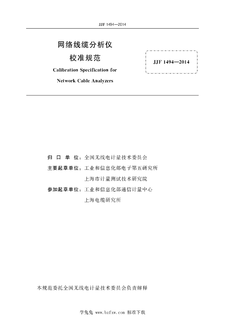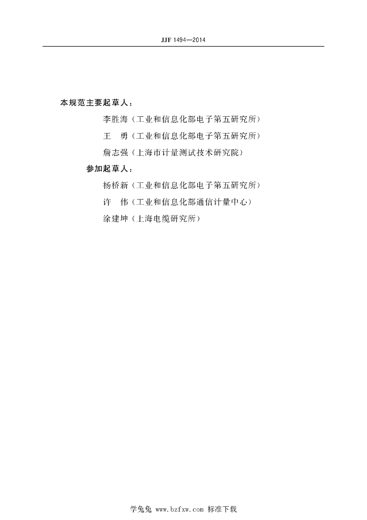 李胜海(工业和信息化部电子第五研究所)、王勇(工业和信息化部电子第五研究所)、詹志强(上海市计量测试技术研究院)、杨桥新(工业和信息化部电子第五研究所)、许伟(工业和信息化部通信计量中心) 、涂建坤(上海电缆研究所)