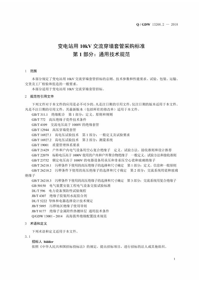 Q/GDW 13268.1-2018 变电站用10kV交流穿墙套管采购标准 第1部分:通用技术规范