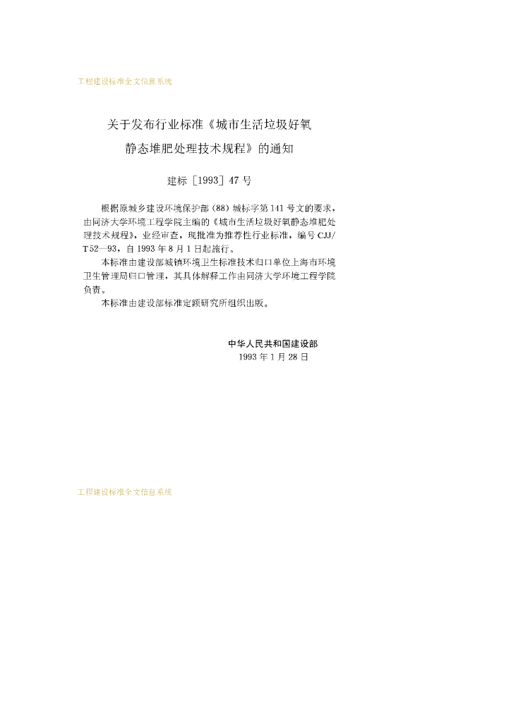 CJJ/T 52-1993 城市生活垃圾好氧静态堆肥处理技术规程