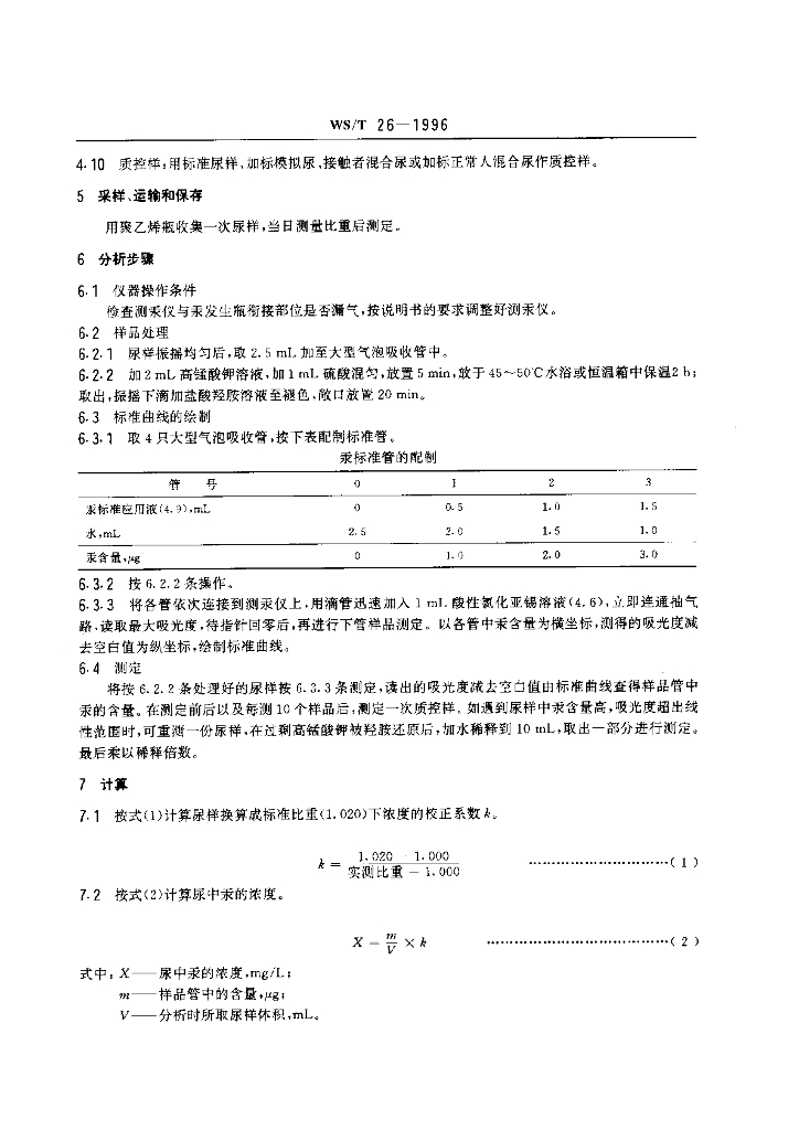 WS/T 26-1996 尿中汞的冷原子吸收光谱测定方法 (二)酸性氯化亚锡还原法