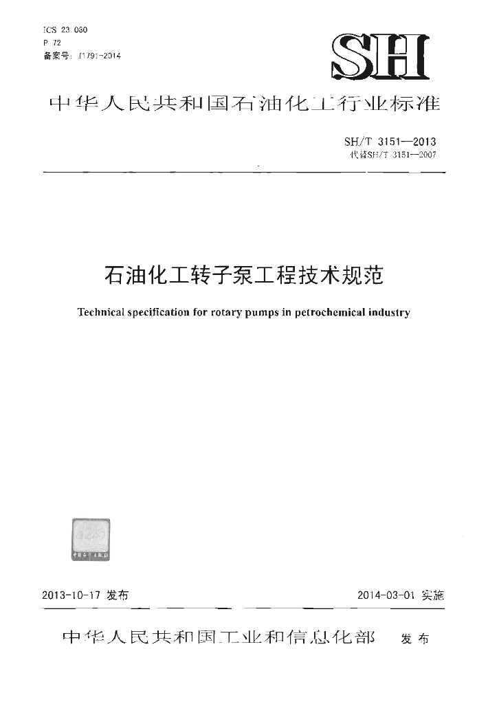 SH/T 3151-2013 石油化工转子泵工程技术规范