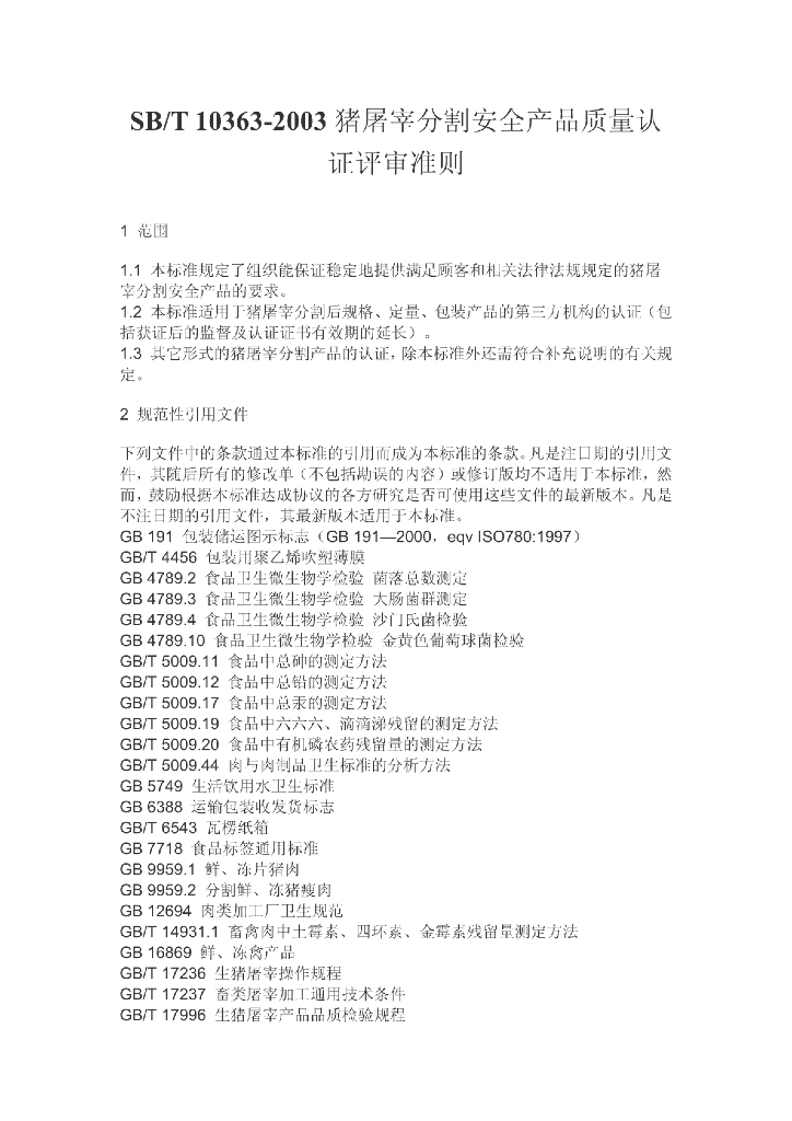 SB/T 10363-2003 猪屠宰分割安全产品质量认证评审准则