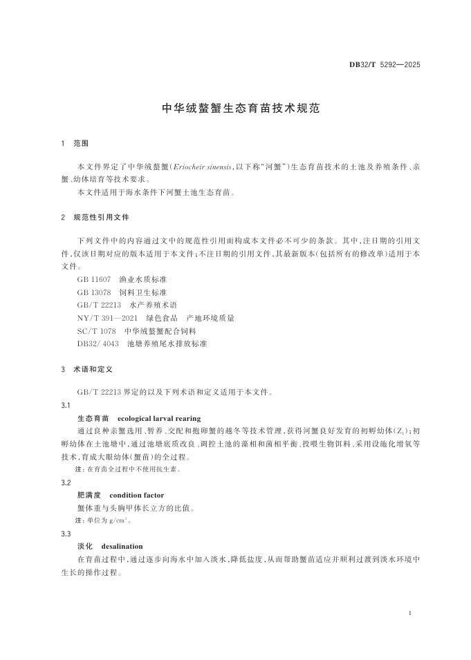 DB32/T 5292-2025 中华绒螯蟹生态育苗技术规范