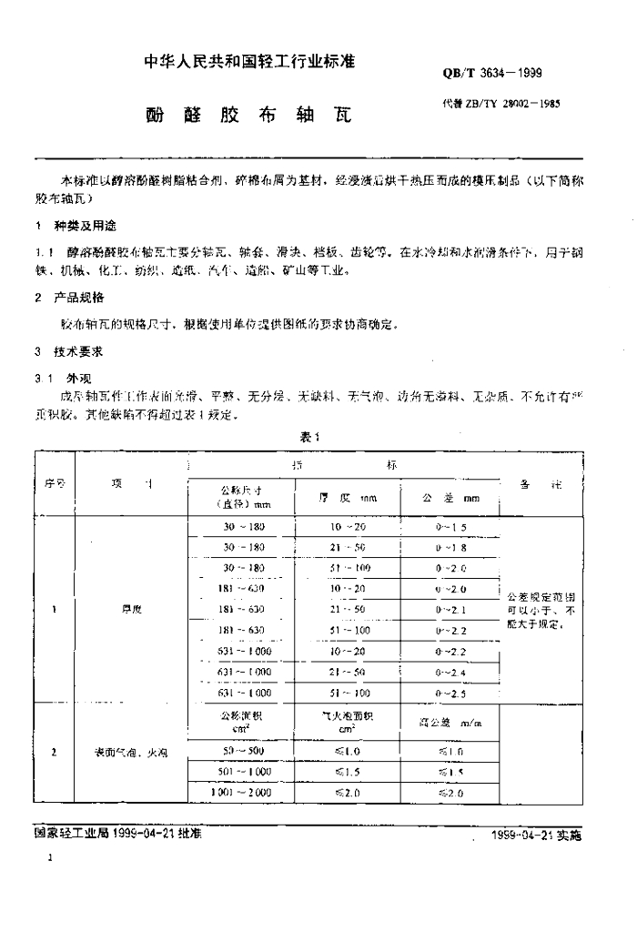 QB/T 3634-1999 酚醛胶布轴瓦