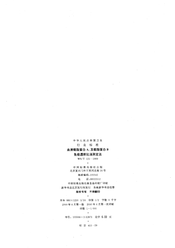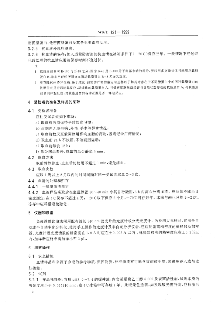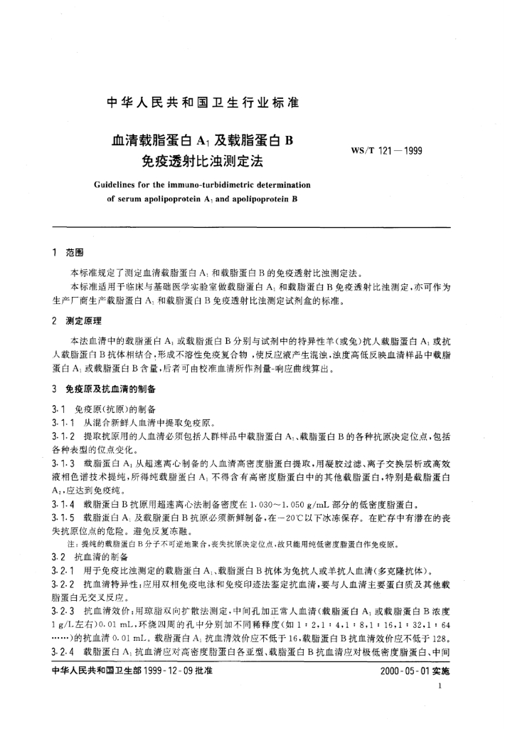 WS/T 121-1999 血清载脂蛋白A1及载脂蛋白B免疫透射比浊测定法