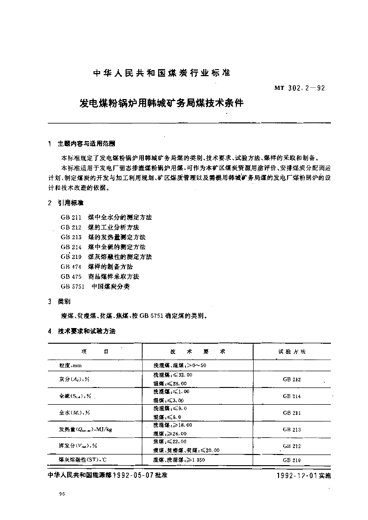 MT 302.2-1992 发电煤粉锅炉用韩城矿务局煤技术条件