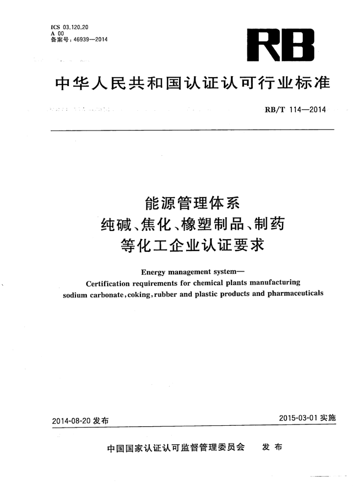 RB/T 114-2014 能源管理体系 纯碱、焦化、橡塑制品、制药等化工企业认证要求