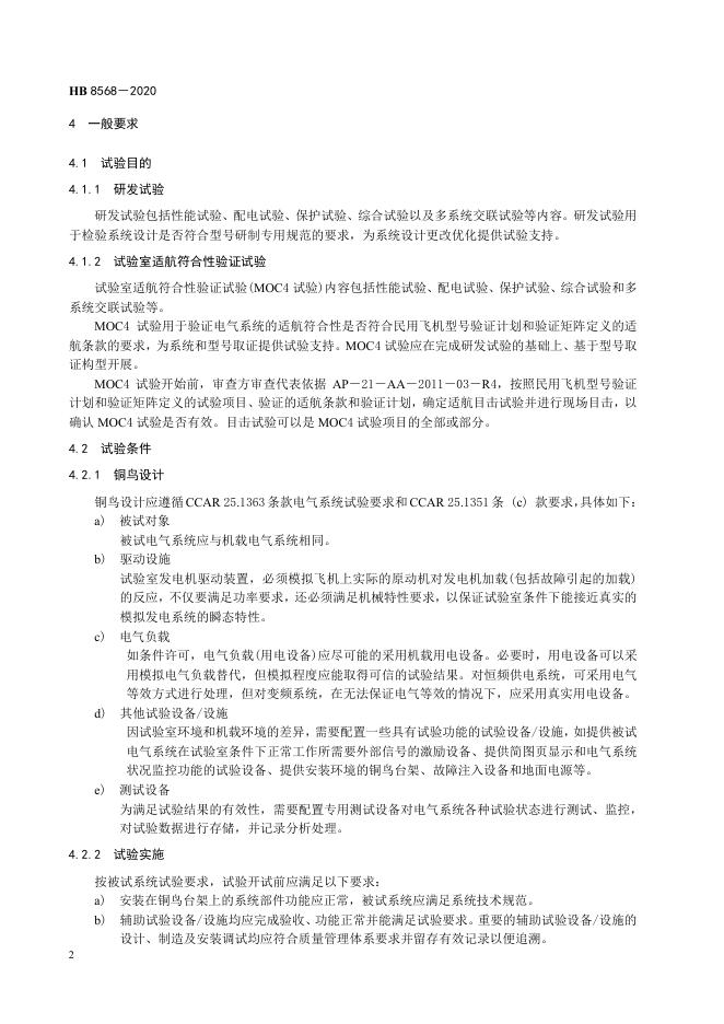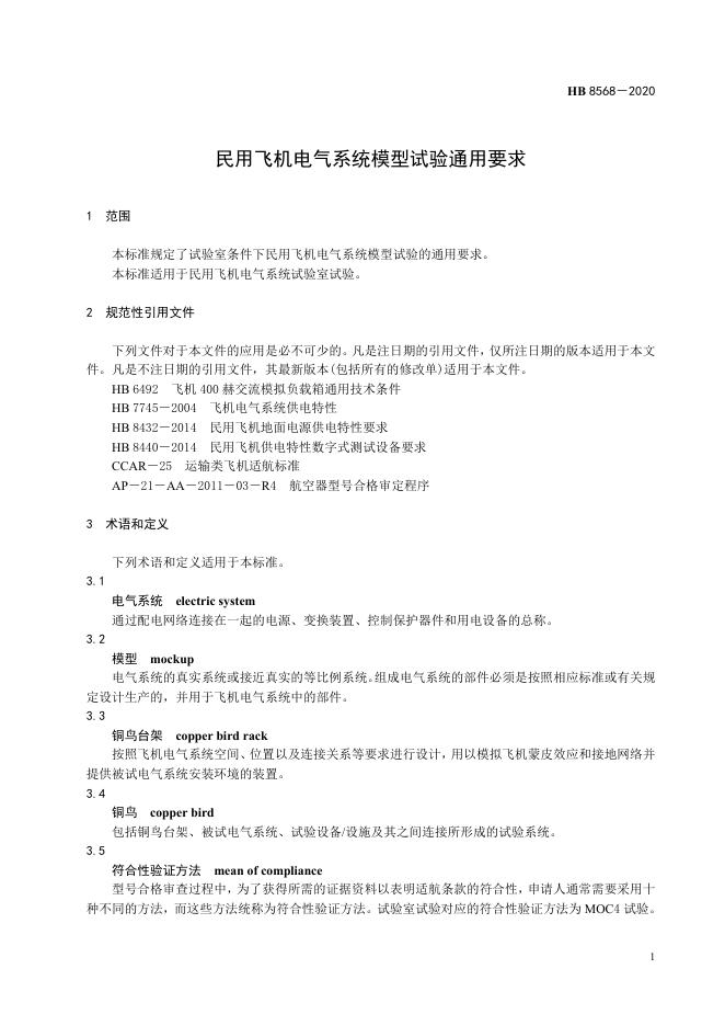 HB 8568-2020 民用飞机电气系统模型试验通用要求