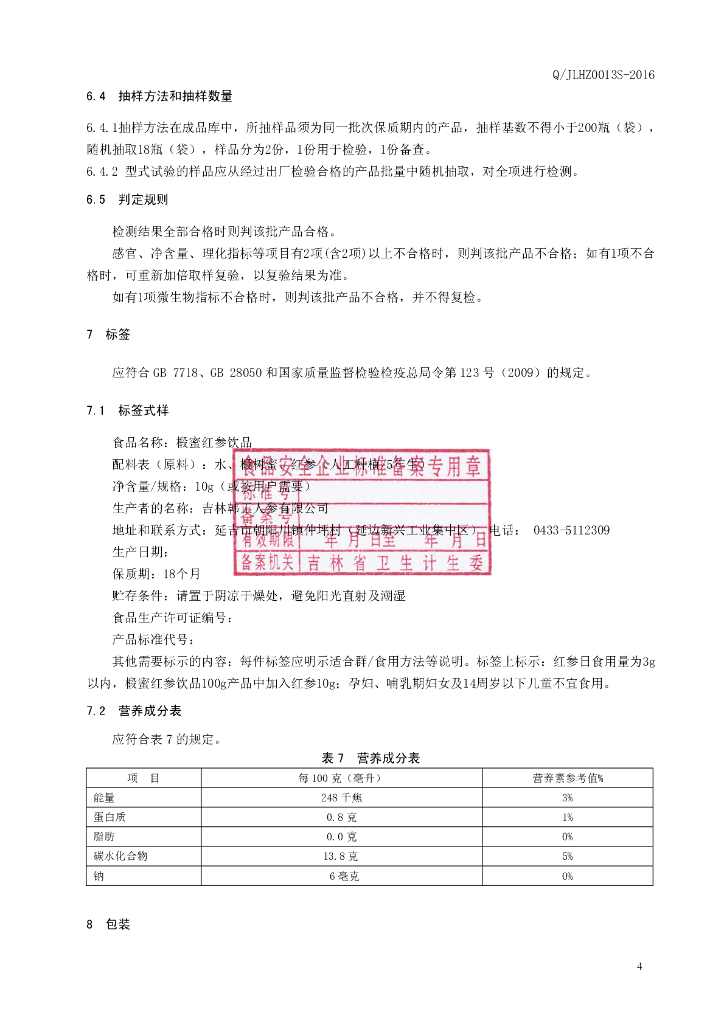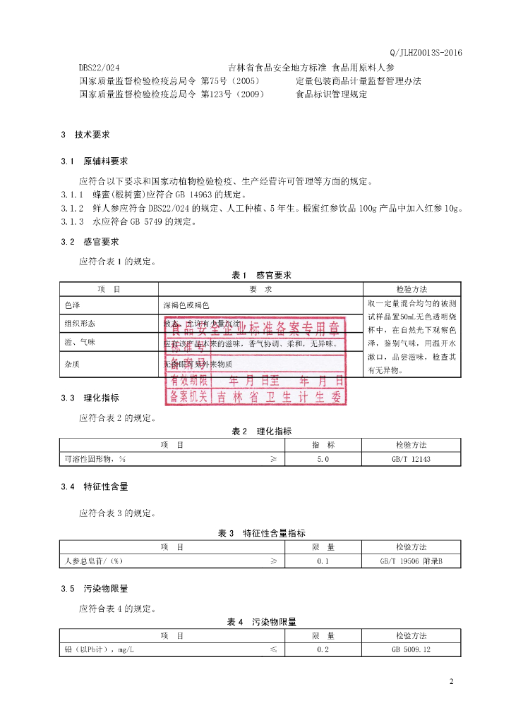 Q/JLHZ 0013S-2016 吉林韩正人参有限公司 椴蜜红参饮品