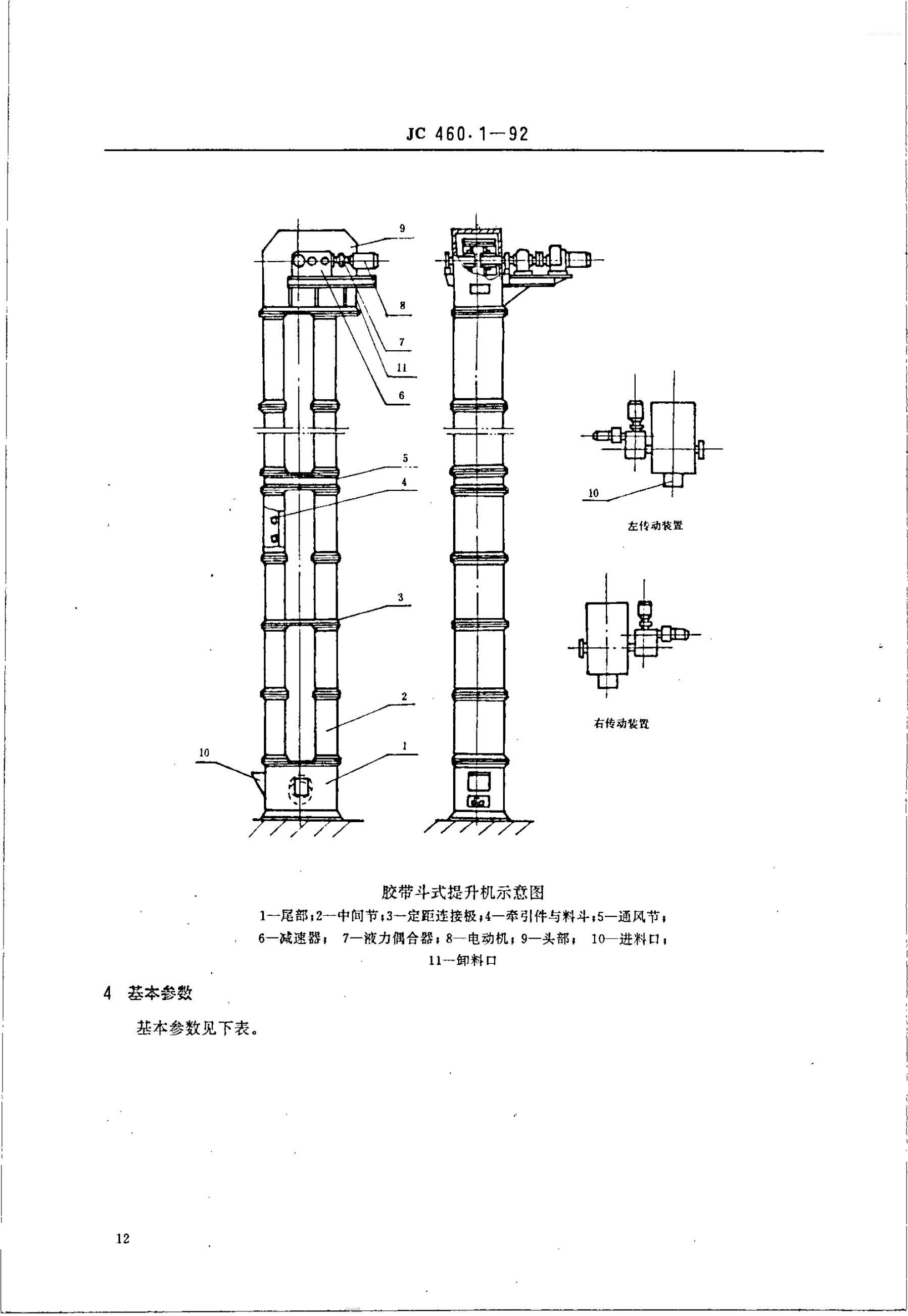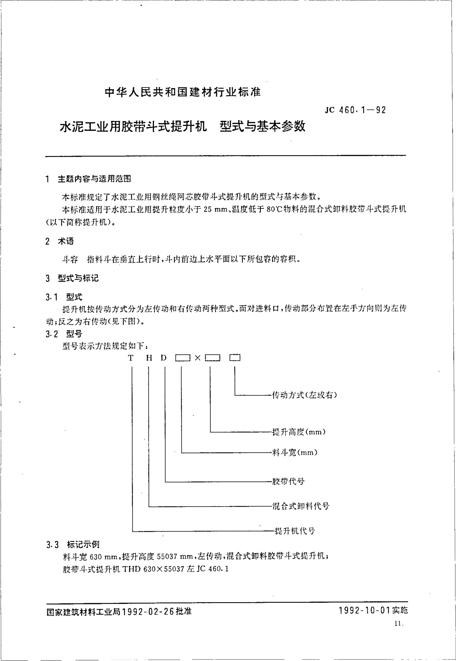 JC 460.1-1992 水泥工业用胶带斗式提升机型式与基本参数