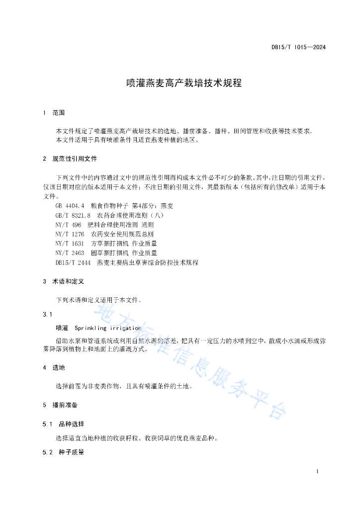 DB15/T 1015-2024 喷灌燕麦高产栽培技术规程