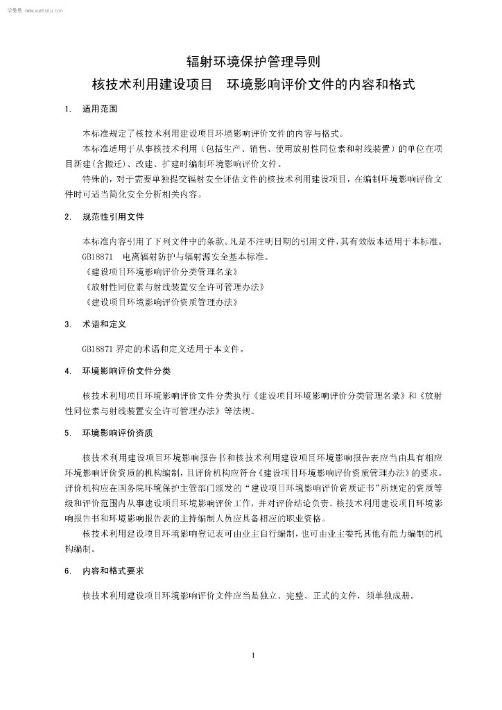 HJ 10.1-2016 辐射环境保护管理导则 核技术利用建设项目 环境影响评价 文件的内容和格式