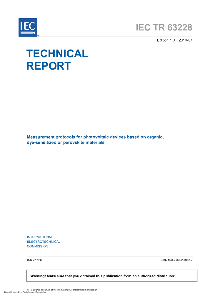 IEC/TR 63228-2019 基于有机、染料敏化或钙钛矿材料的光伏器件的测量协议