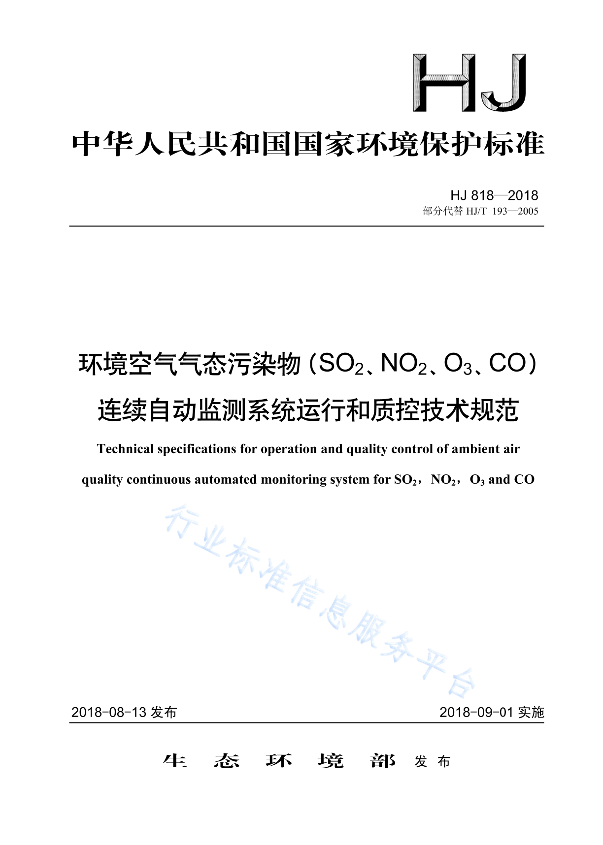 HJ 818-2018 环境空气气态污染物(SO2、NO2、O3、CO)连续自动监测系统运行和质控技术规范