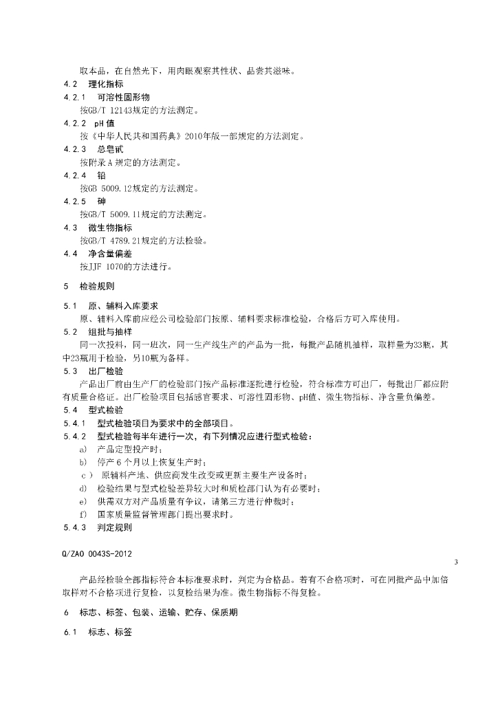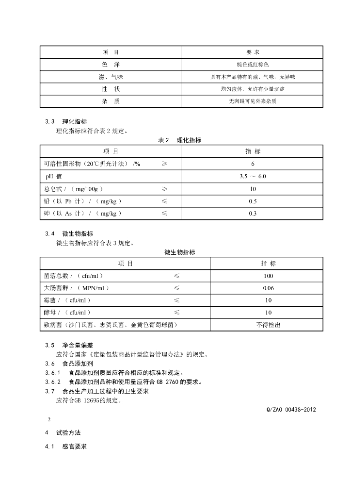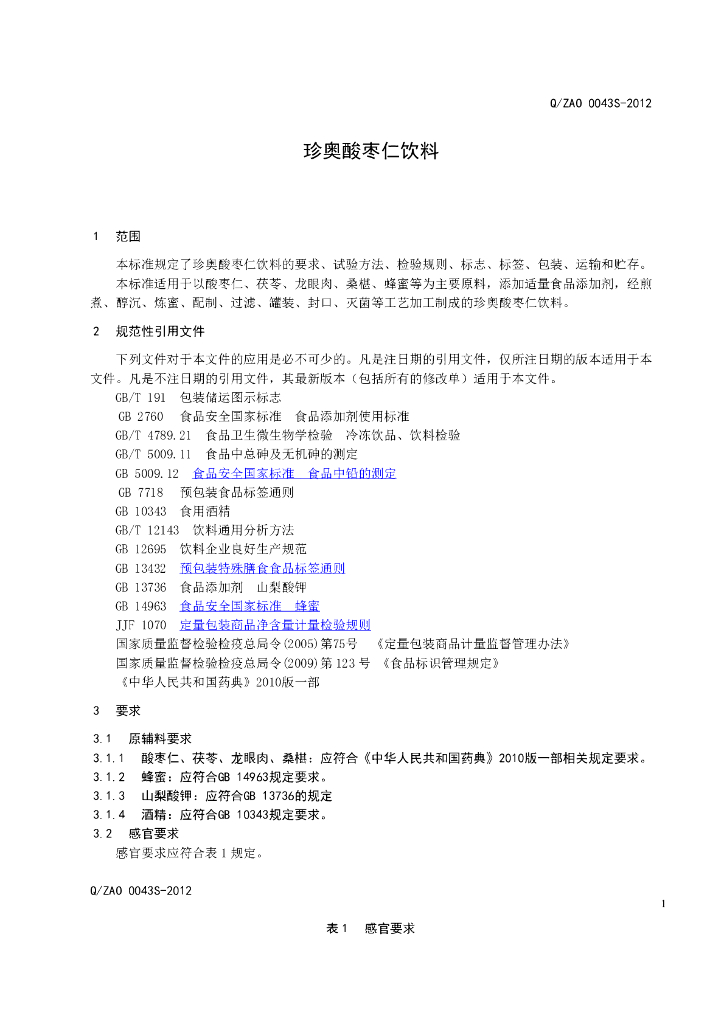 Q/ZAO 0043S-2012 珍奥酸枣仁饮料