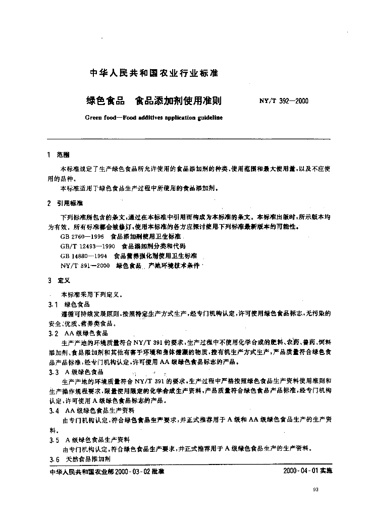 NY/T 392-2000 绿色食品 食品添加剂使用准则