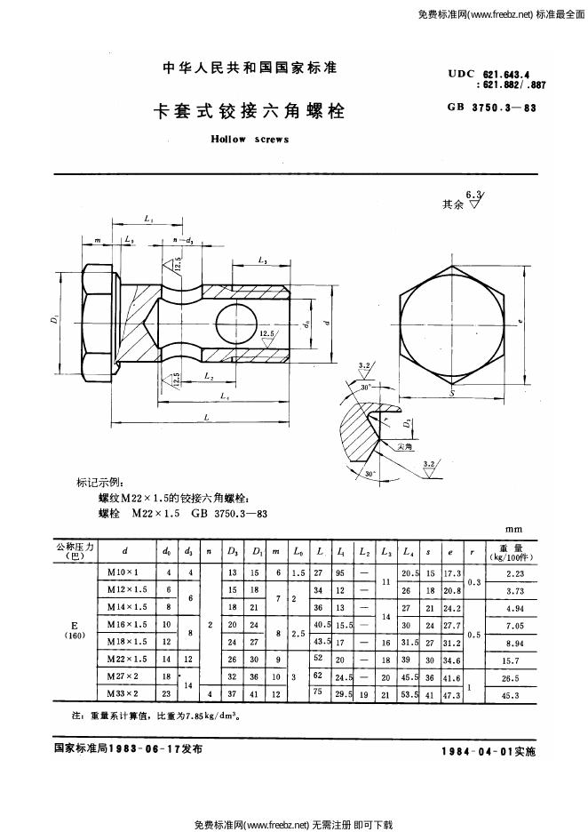 GB/T 3750.3-1983 卡套式铰接六角螺栓
