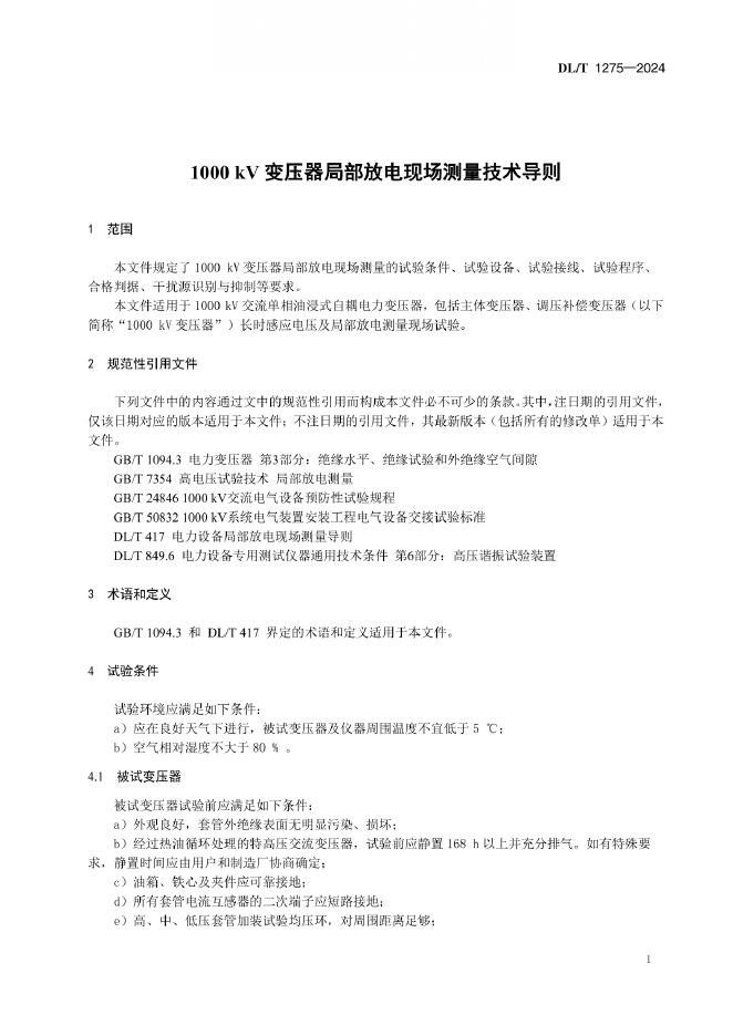 DL/T 1275-2024 1000kV变压器局部放电现场测量技术导则