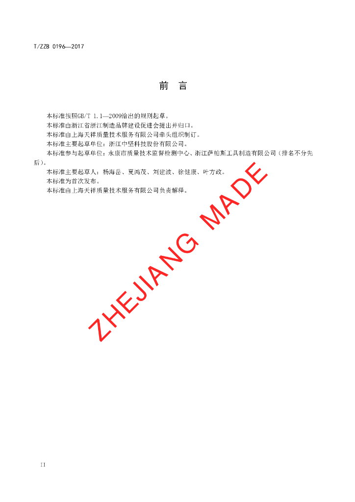 本标准由上海天祥质量技术服务有限公司牵头组织制订。 、本标准主要起草单位:浙江中坚科技股份有限公司。、本标准参与起草单位:永康市质量技术监督检测中心、浙江萨帕斯工具制造有限公司(排名不分先后)。
