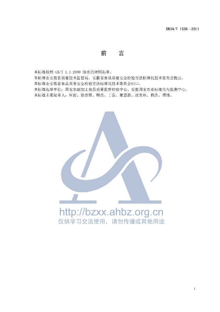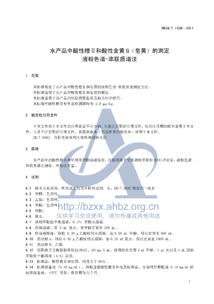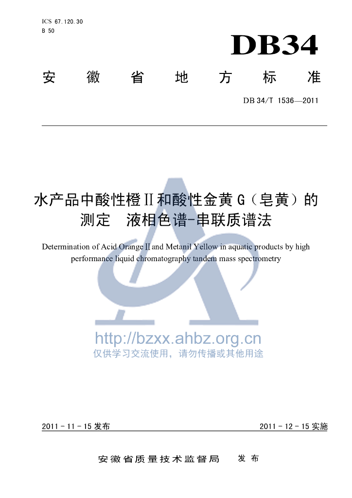 DB34/T 1536-2011 水产品中酸性橙Ⅱ和酸性金黄G(皂黄)的测定 液相色谱-串联质谱法
