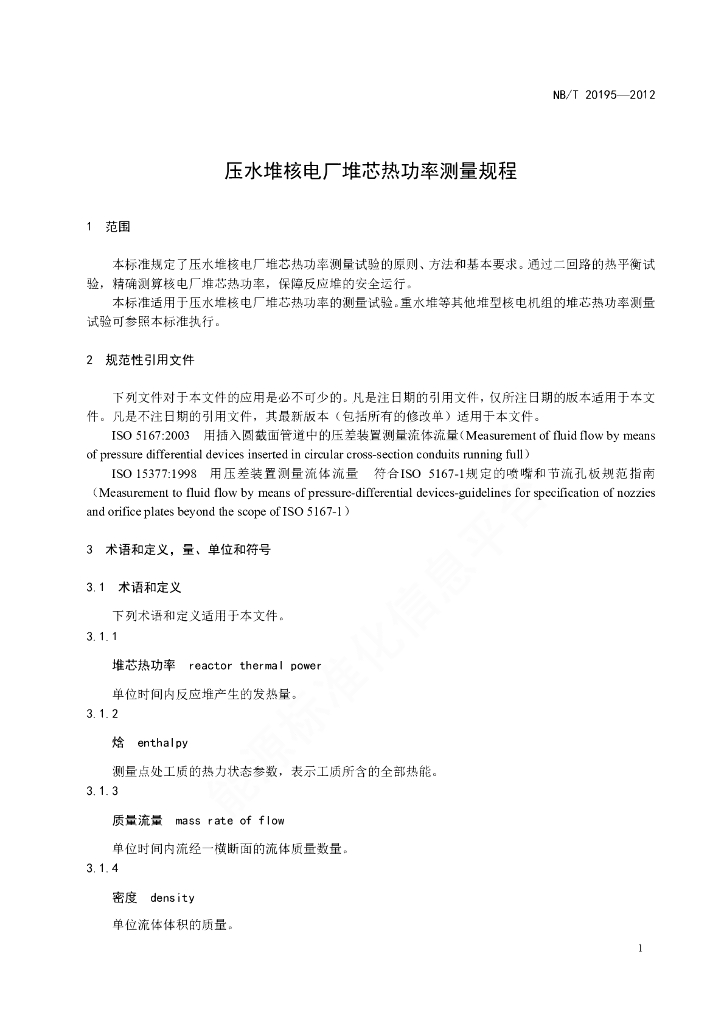 NB/T 20195-2012 压水堆核电厂堆芯热功率测量规程