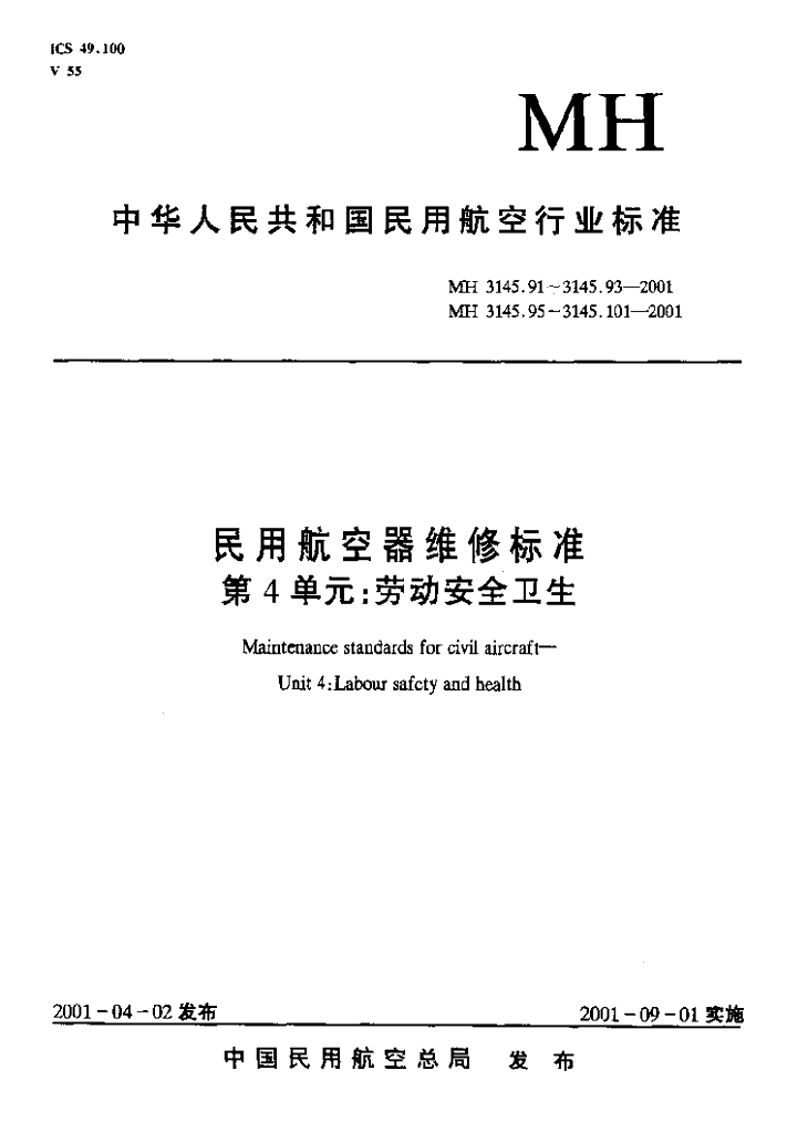MH 3145.97-2001 民用航空器维修标准 第4单元 劳动安全卫生 第97部分 起重设备安全管理规则