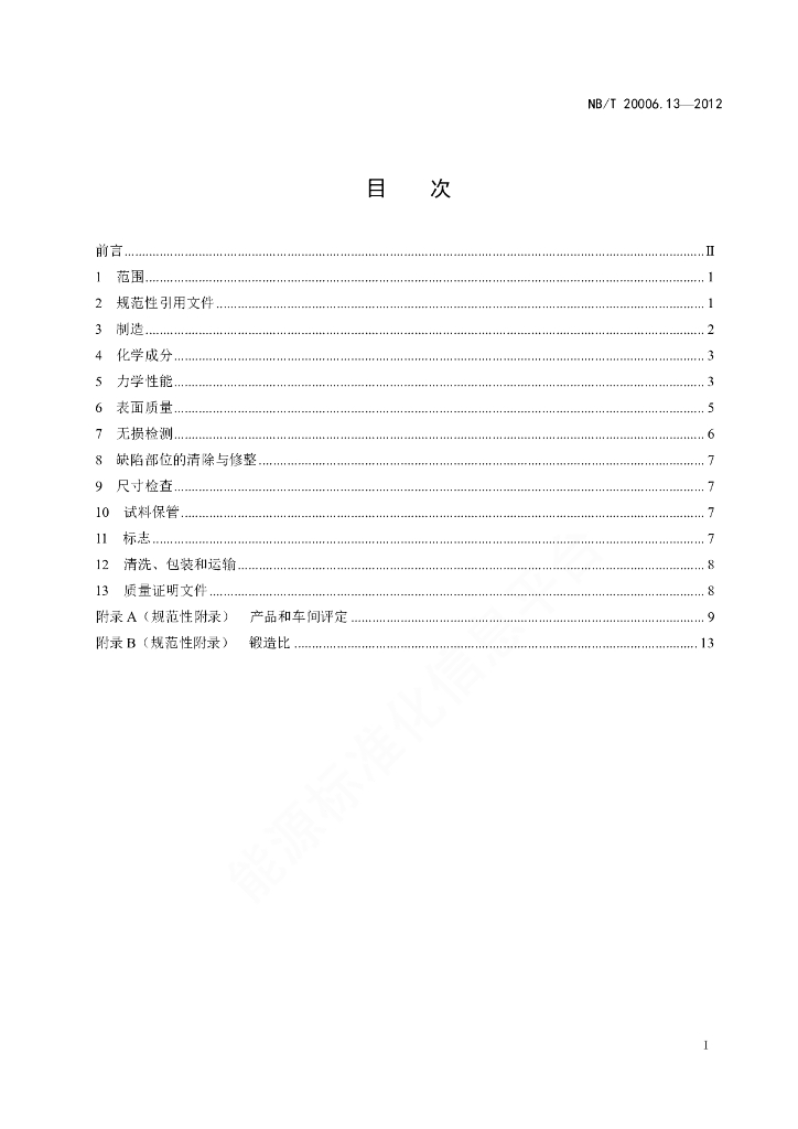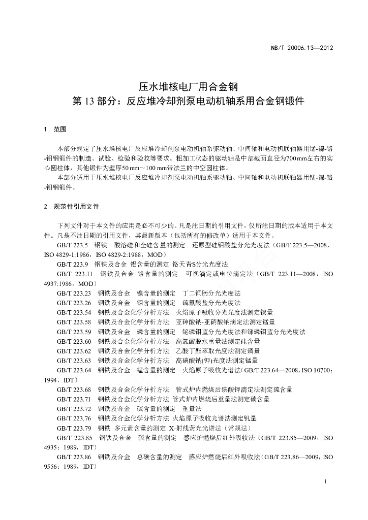 NB/T 20006.13-2012 压水堆核电厂用合金钢 第13部分:反应堆冷却剂泵电动机轴系用合金钢锻件