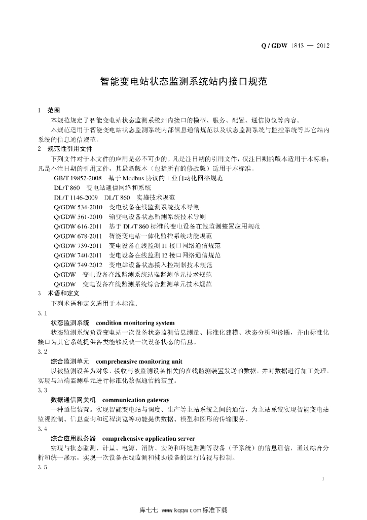 Q/GDW 1843-2012 智能变电站状态监测系统站内接口规范