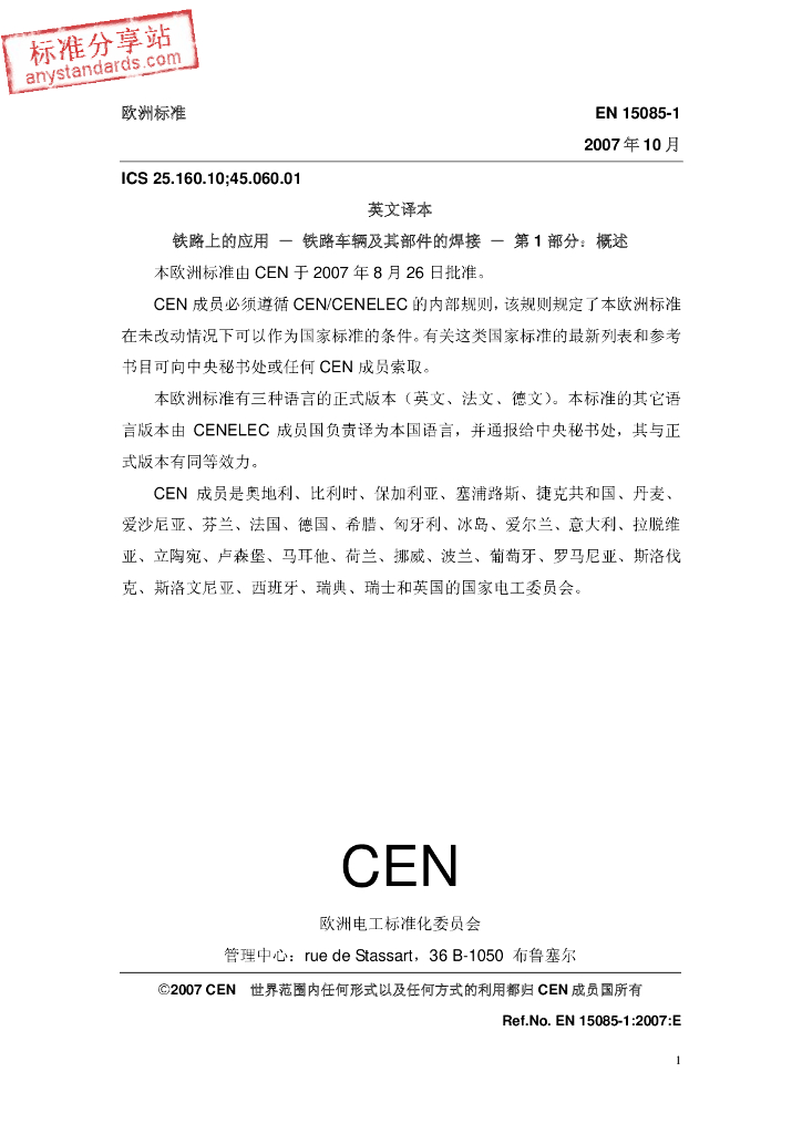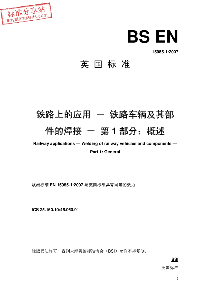 BS EN 15085-1-2007 铁路上的应用-铁路车辆及其部件的焊接-第1部分:概述