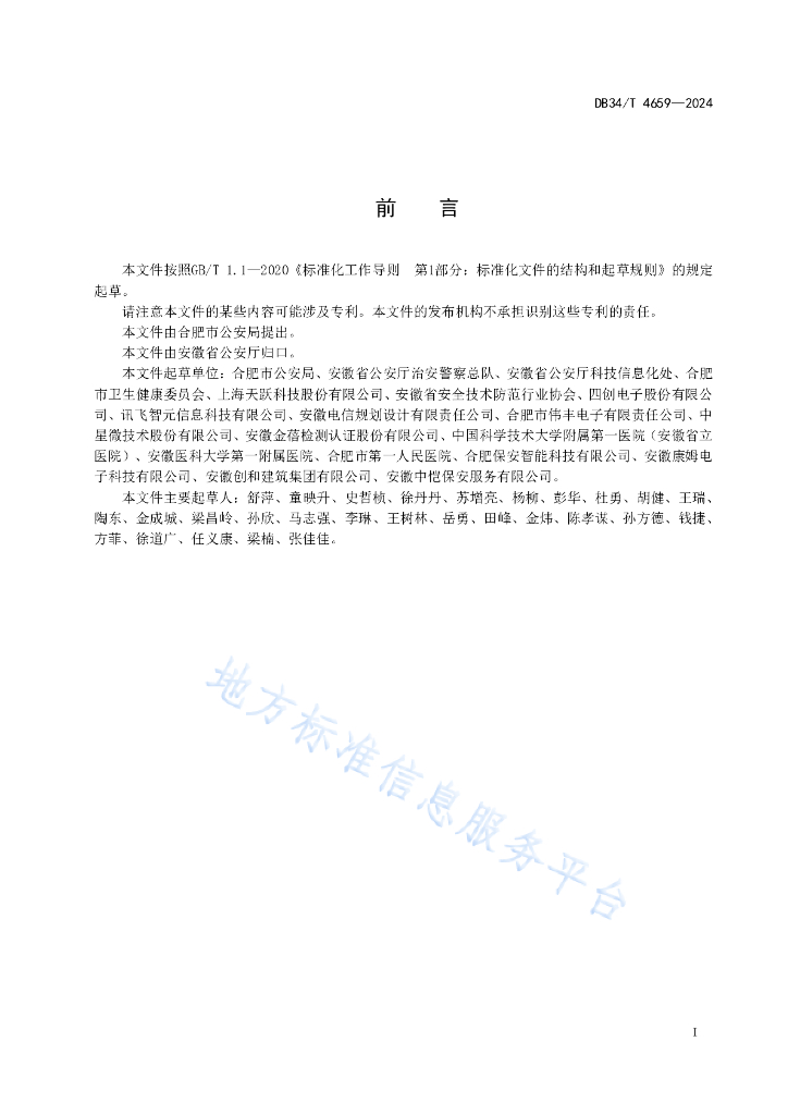 合肥市公安局、安徽省公安厅治安警察总队、安徽省公安厅科技信息化处、合肥市卫生健康委员会、上海天跃科技股份有限公司、安徽省安全技术防范行业协会、四创电子股份有限公司、讯飞智元信息科技有限公司、安徽电信规划设计有限责任公司、合肥市伟丰电子有限责任公司、中星微技术股份有限公司、安微金蓓检测认证股份有限公司、中国科学技术大学附属第一医院(安徽省立医院)、安徽医科大学第一附属医院、合肥市第一人民医院、合肥保安智能科技有限公司、安徽康姆电子科技有限公司、安徽创和建筑集团有限公司、安徽中恺保安服务有限公司