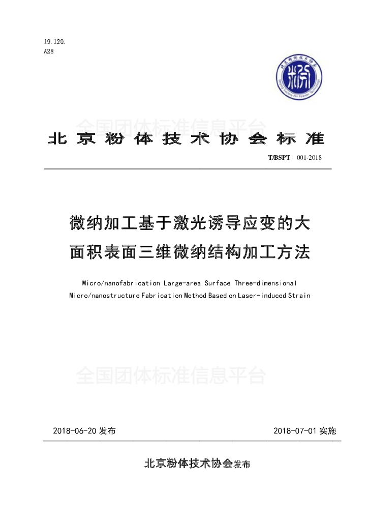 T/BSPT 001-2018 微纳加工 基于激光诱导应变的大面积表面三维微纳结构加工方法