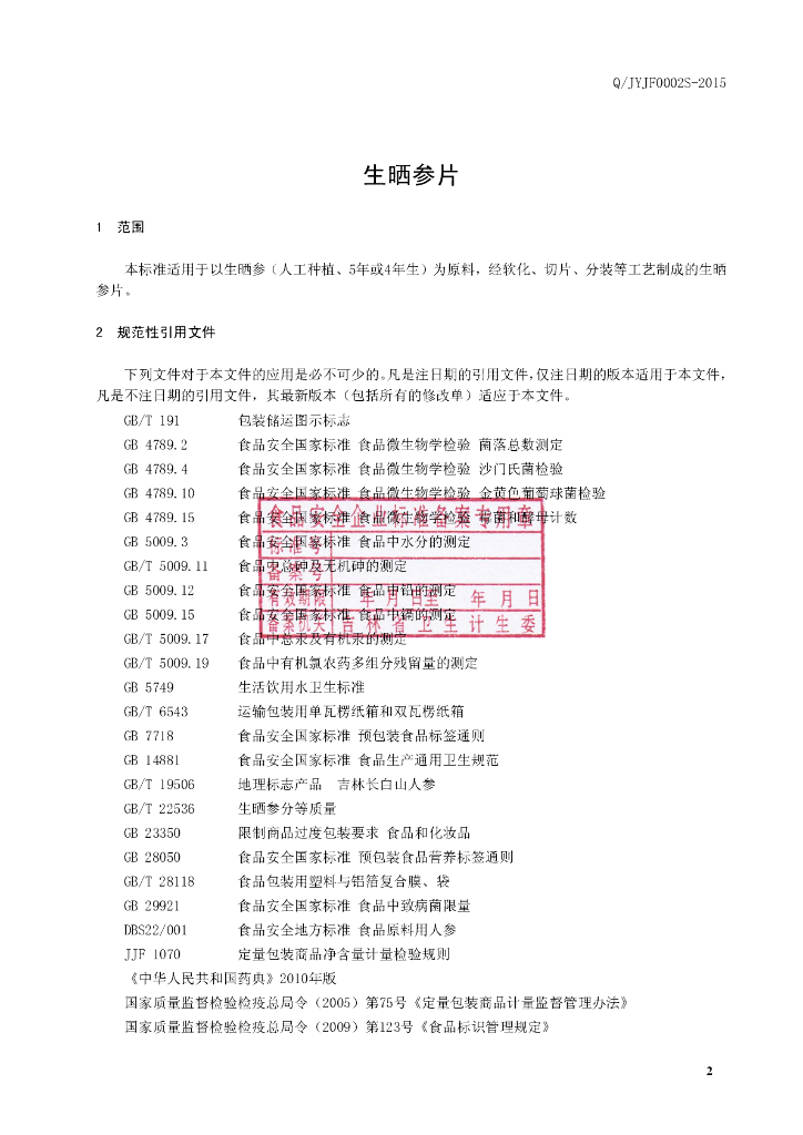 Q/JYJF 0002S-2015 集安亿家福参茸制品有限公司 生晒参片
