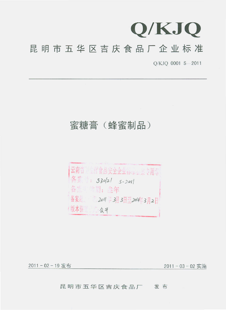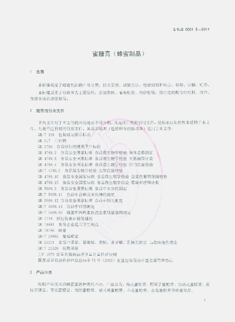 Q/KJQ 0001S-2011 蜜糖膏(蜂蜜制品)