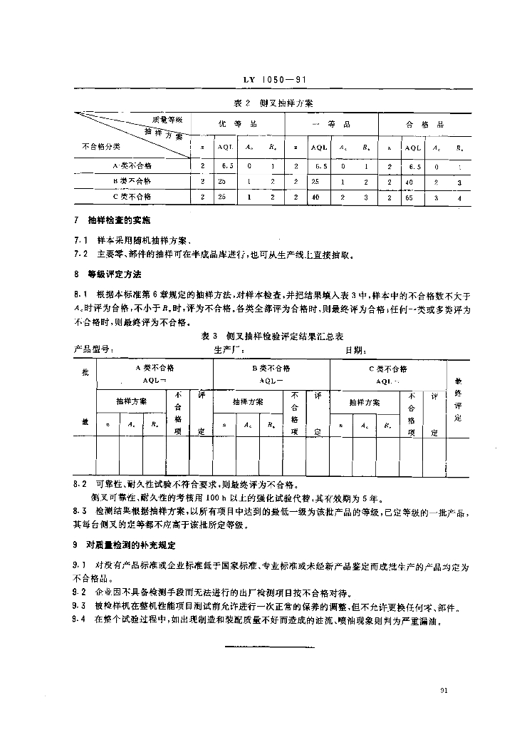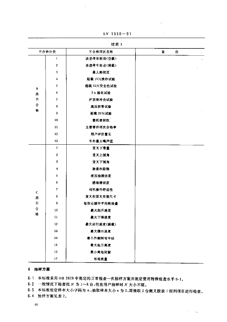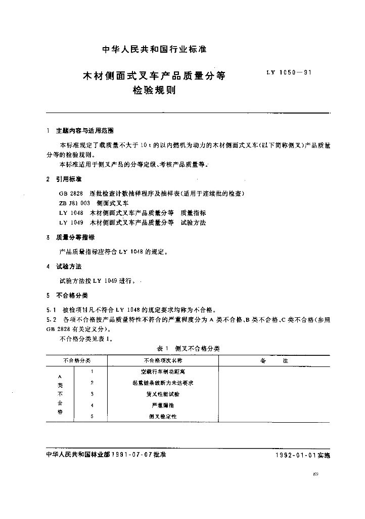 LY 1050-1991 木材侧面式叉车产品质量分等检验规则