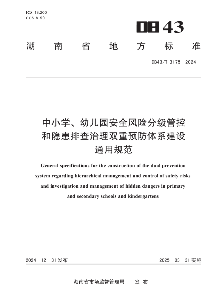 DB43/T 3175-2024 中小学、幼儿园安全风险分级管控和隐患排查治理双重预防体系建设通用规范