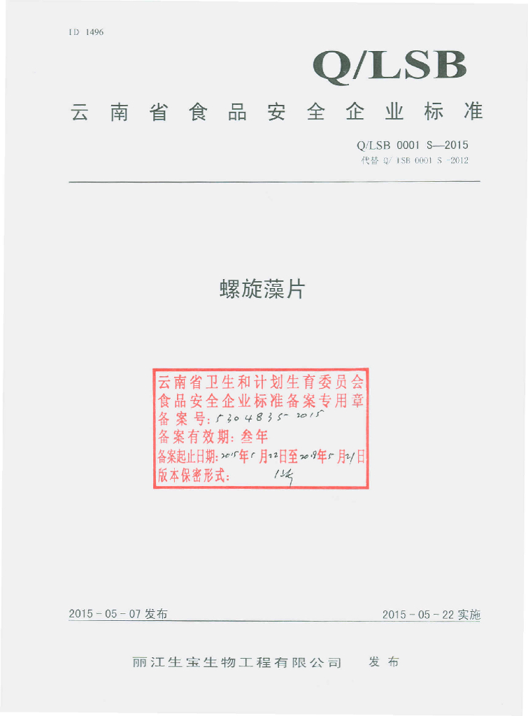 Q/LSB 0001S-2015 丽江生宝生物工程有限公司 螺旋藻片