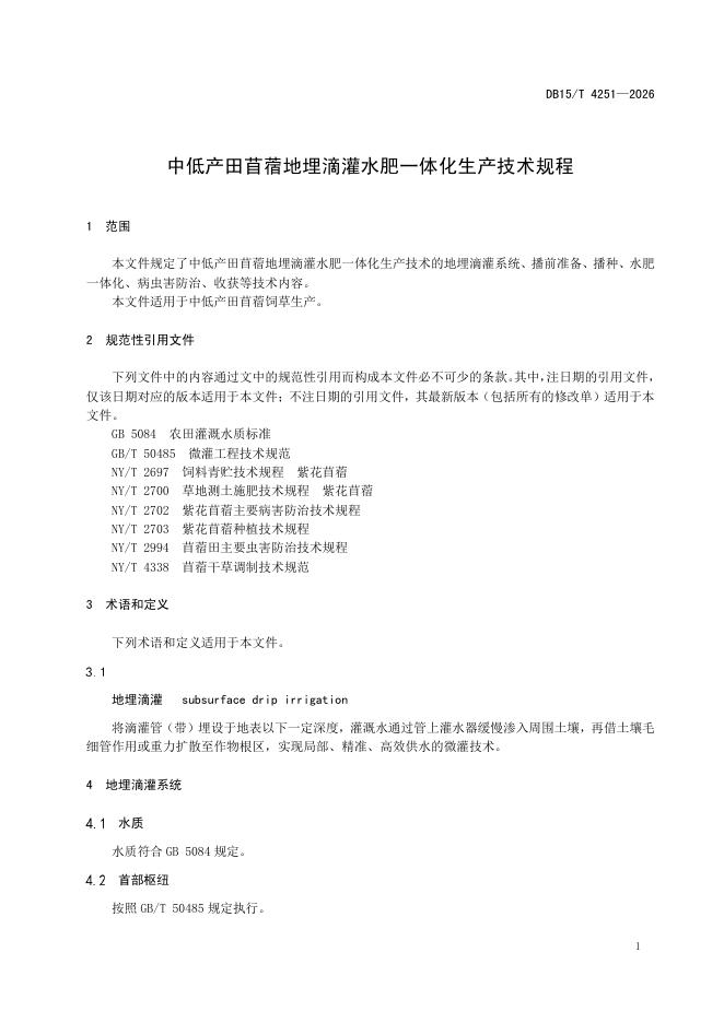 DB15/T 4251-2026 中低产田苜蓿地埋滴灌水肥一体化生产技术规程