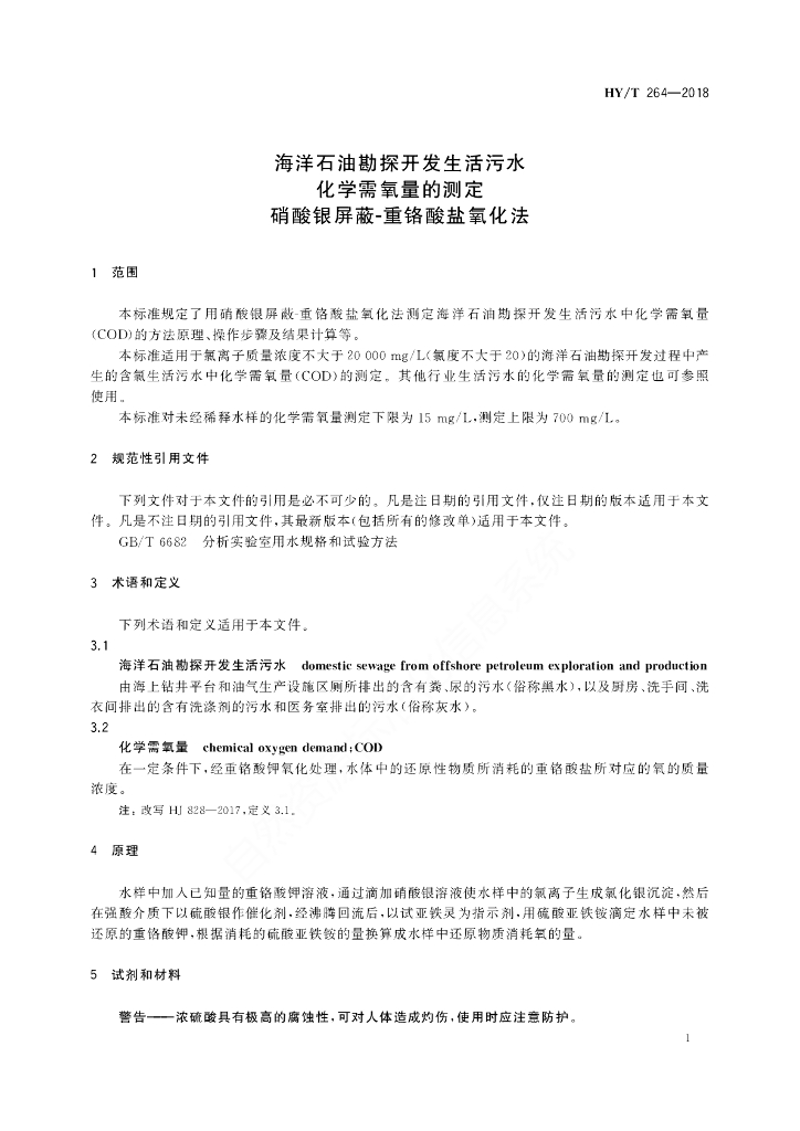 HY/T 264-2018 海洋石油勘探开发生活污水 化学需氧量的测定 硝酸银屏蔽-重铬酸盐氧化法