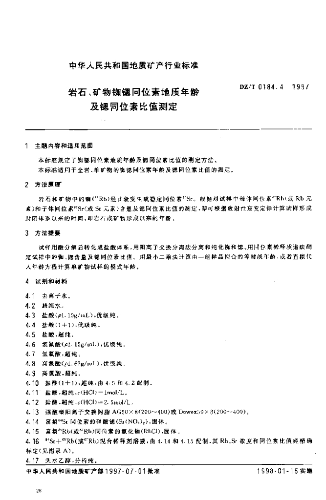 DZ/T 0184.4-1997 岩石、矿物铷锶同位素地质年龄及锶同位素比值测定