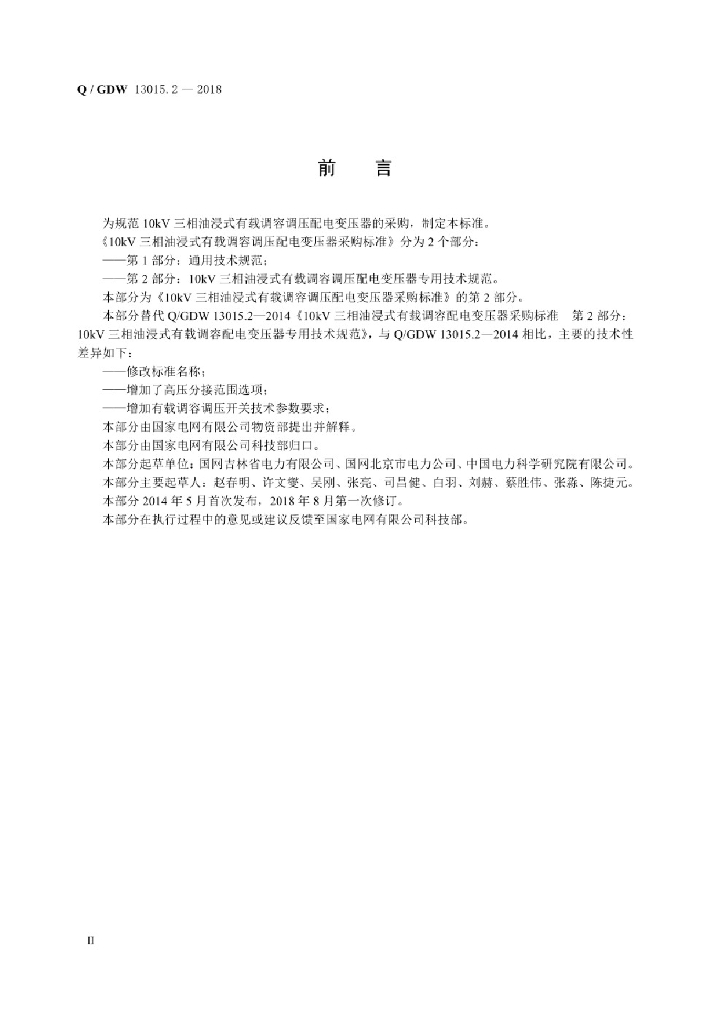 Q/GDW 13015.2-2018 10kV三相油浸式有载调容调压配电变压器采购标准 第2部分:10kV三相油浸式有载调容配电变压器专用技术规范