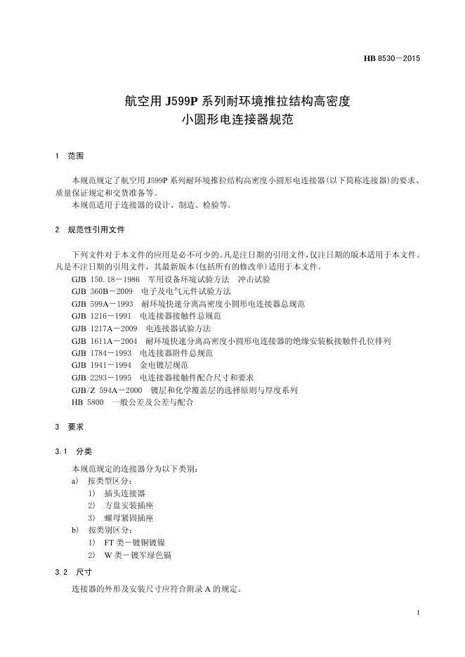 HB 8530-2015 航空用J599P系列耐环境推拉结构高密度小圆形电连接器规范(2017)