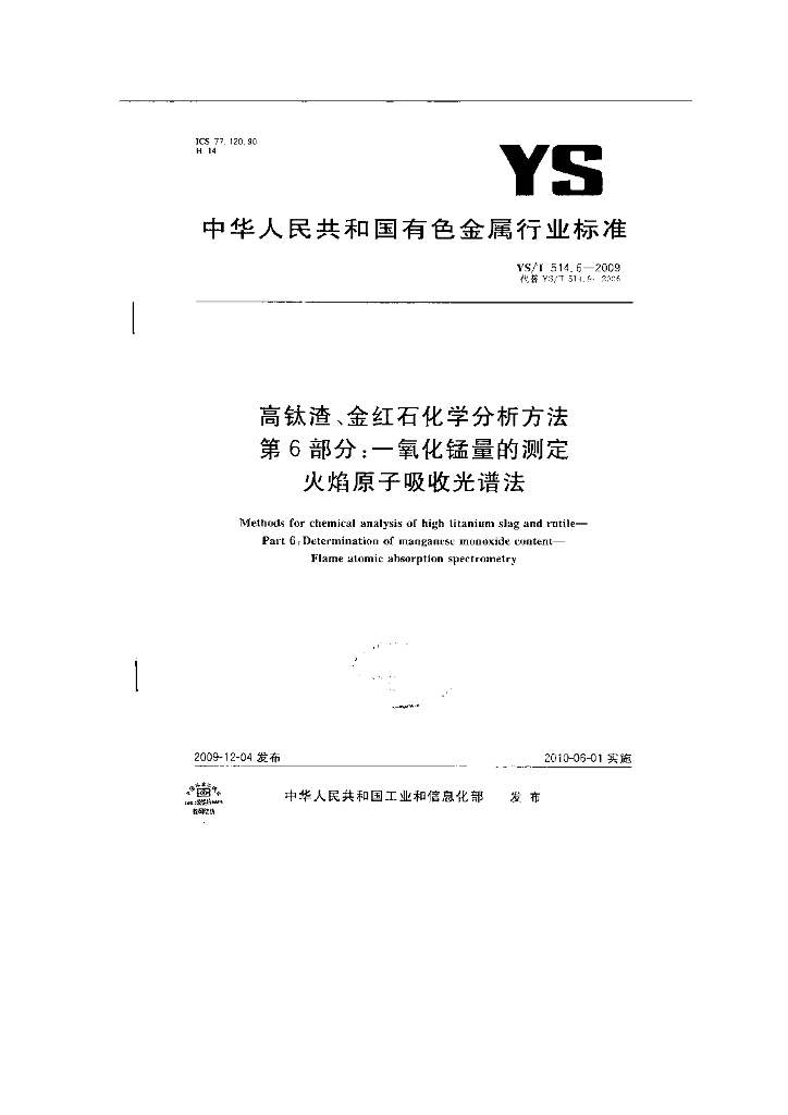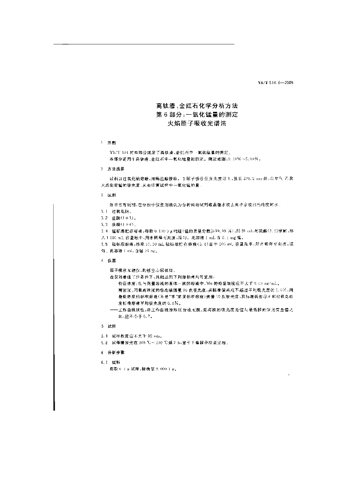 YS/T 514.6-2009 高钛渣、金红石化学分析方法 第6部分:一氧化锰量的测定 火焰原子吸收光谱法