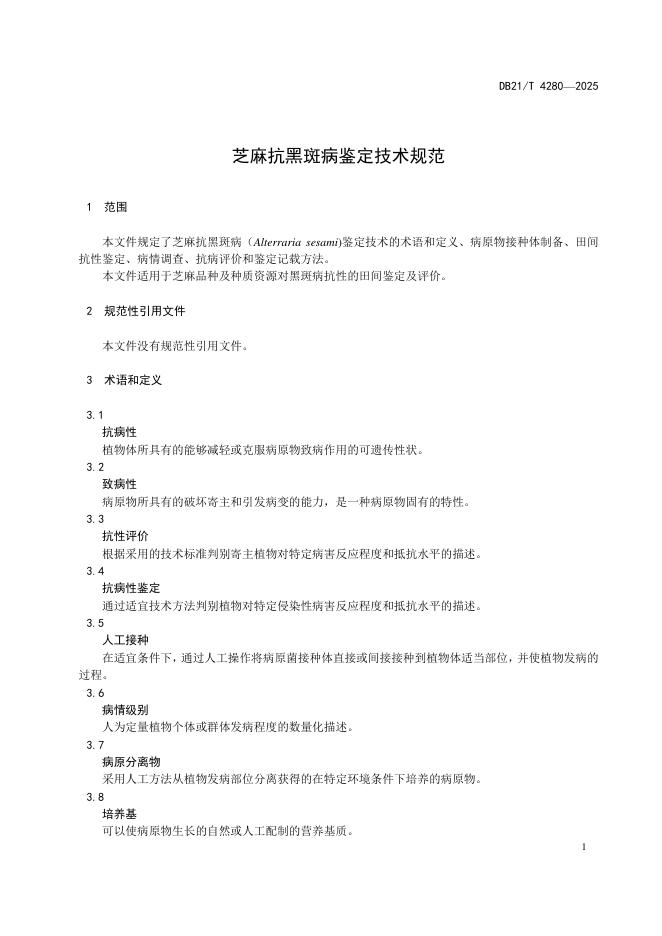 DB21/T 4280-2025 芝麻抗黑斑病鉴定技术规范