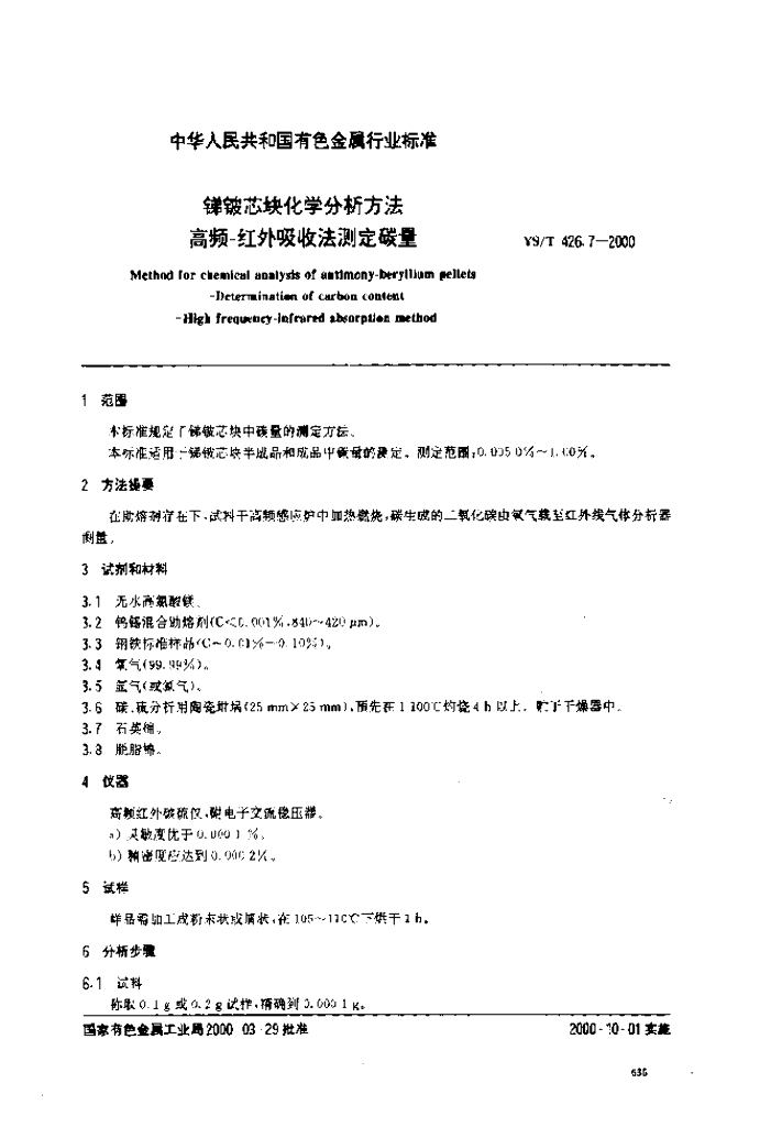 YS/T 426.7-2000 锑铍芯块化学分析方法高频-红外吸收法测定碳量