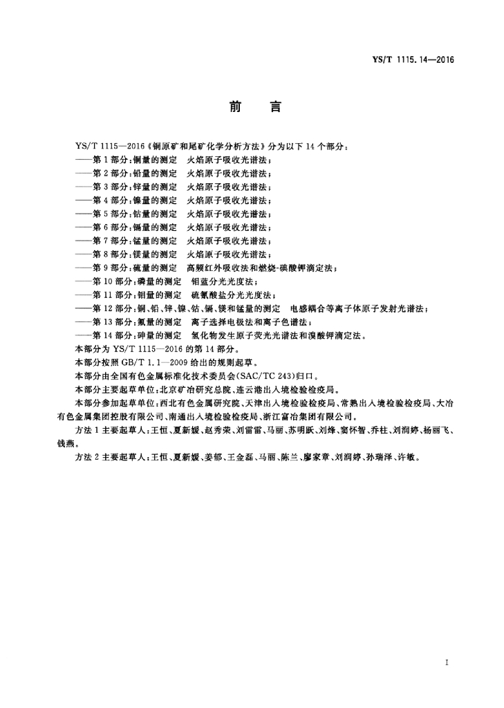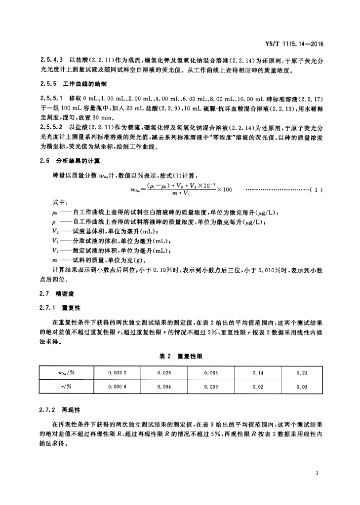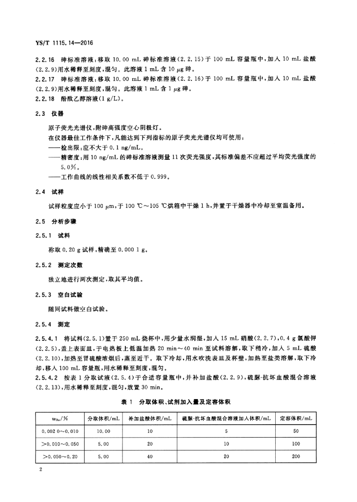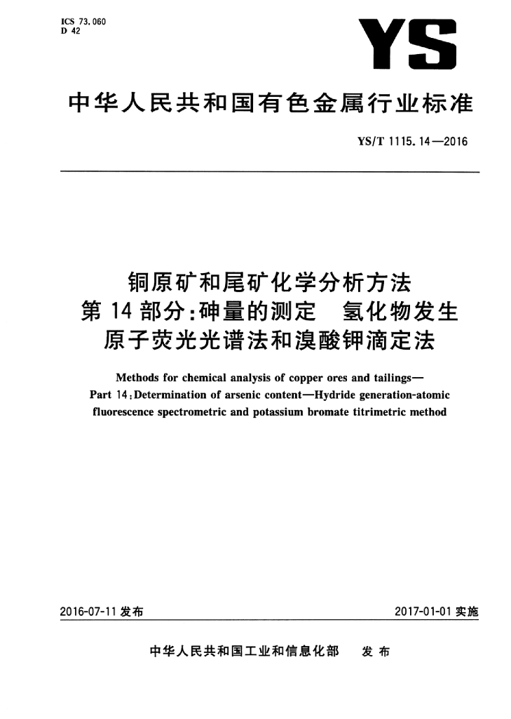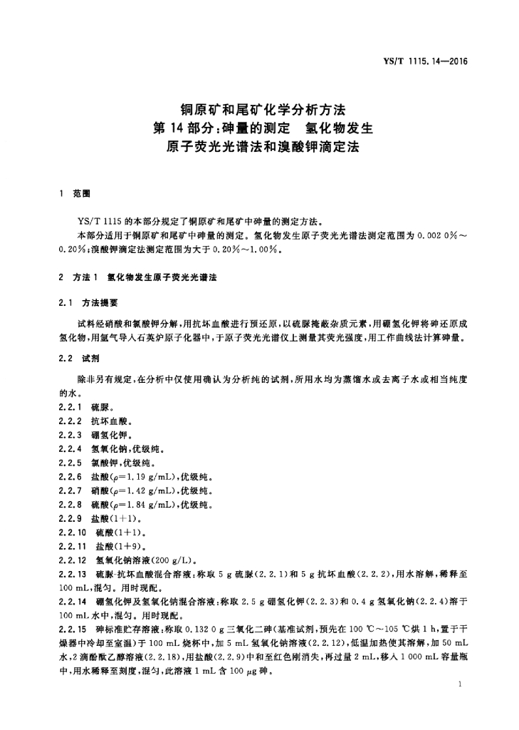 YS/T 1115.14-2016 铜原矿和尾矿化学分析方法 第14部分:砷量的测定氢化物发生原子荧光光谱法和溴酸钾滴定法