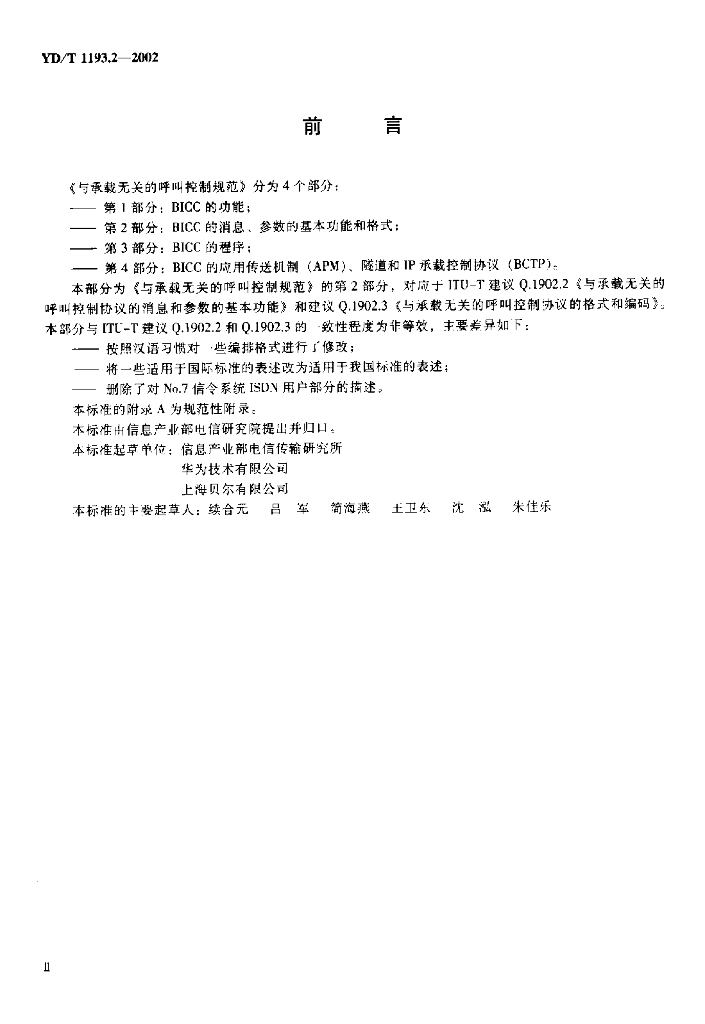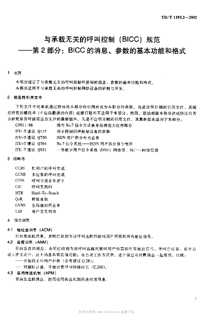 YD/T 1193.2-2002 与承载无关的呼叫控制(BICC)规范——第2部分:BICC 的消息、参数的基本功能和格式
