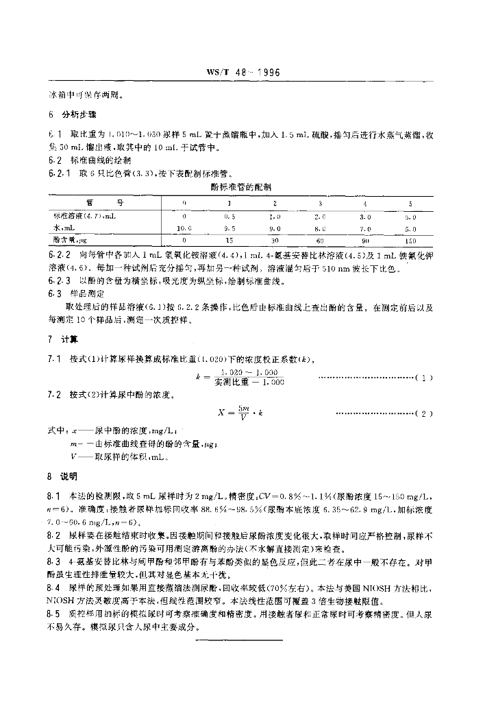 WS/T 48-1996 尿中酚的分光光度测定方法